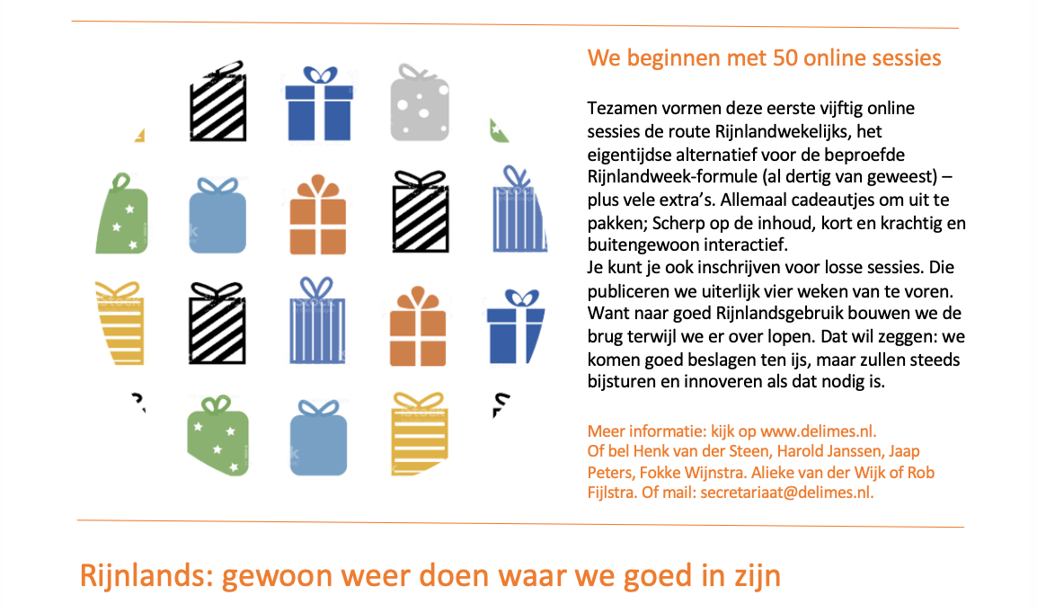 Daarom gaan we gezamenlijk met hen het collectieve geheugen op het gebied van samenwerking flink opschudden. Vanaf 9 april is elke vrijdagmiddag Rijnlandvrijdag. Je kunt je aanmelden voor een vaste Rijnlandgroep; dit naast de offline Rijnlandweek (Summercourse). Maar je kunt je ook op een of meerdere losse vrijdagen aansluiten; om je kennis op te frissen, je denken aan te scherpen, je andere perspectieven te leren zien en je met andere Rijnlanders in contact te brengen.